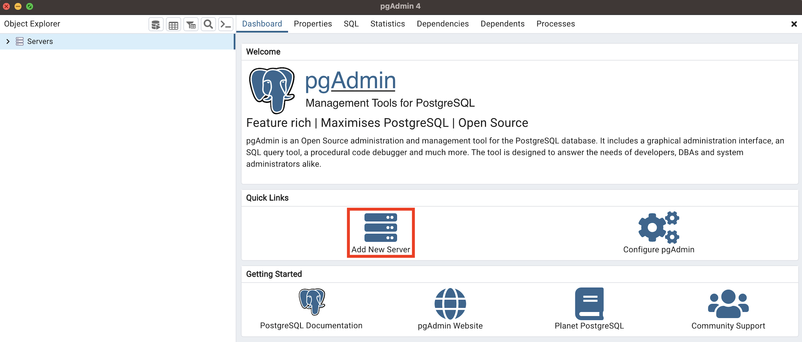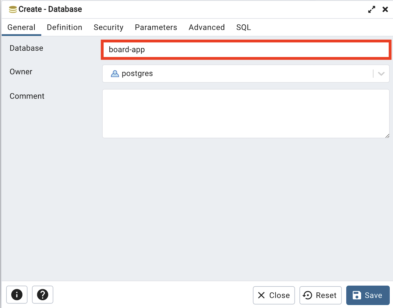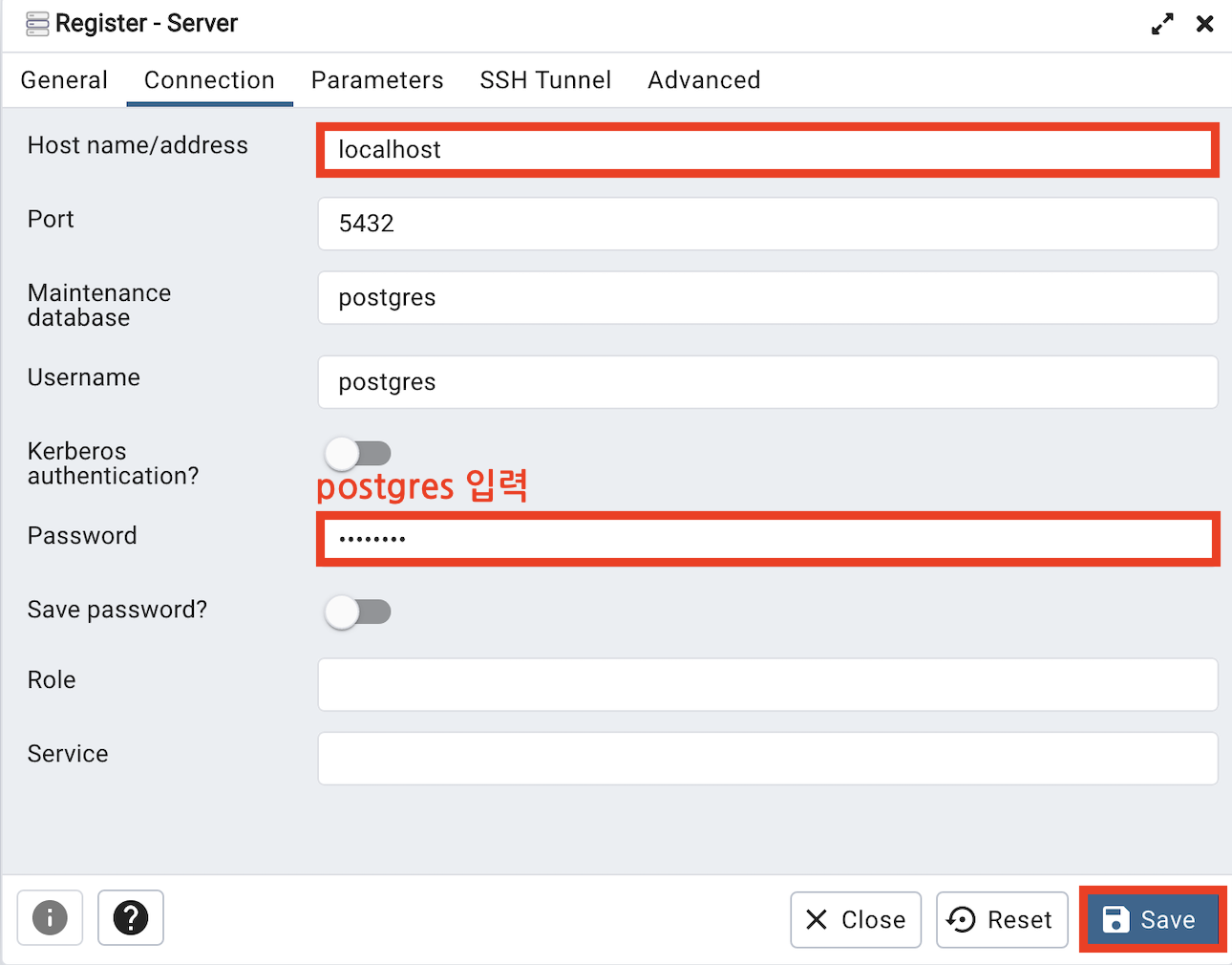 Host name/address 부분에 localhost 입력, 비밀번호는 postgres를 입력한다.