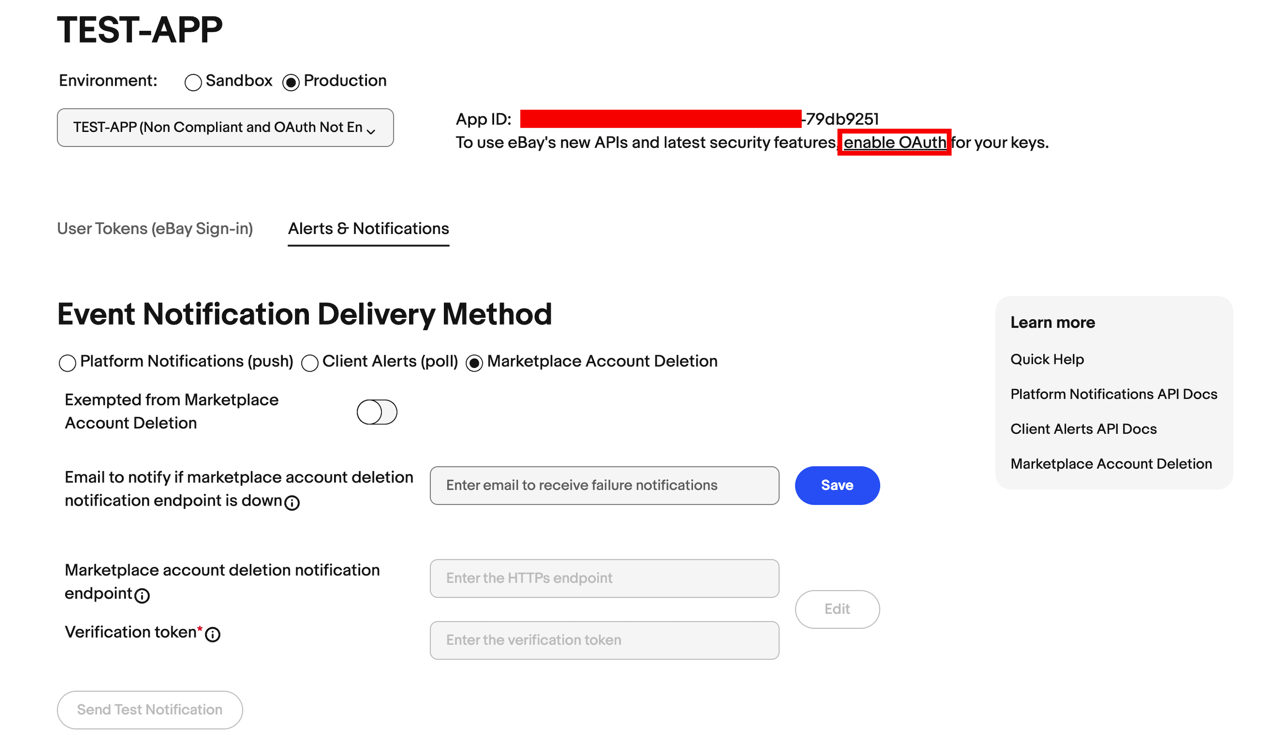 TEST-APP이 생성되었지만, 사용할 수 없다고 나온다. 내용을 읽어보면, 마켓플레이스 삭제/계정 폐쇄 통지 절차를 준수하거나 면제신청을 해야한다는 문구가 있다.